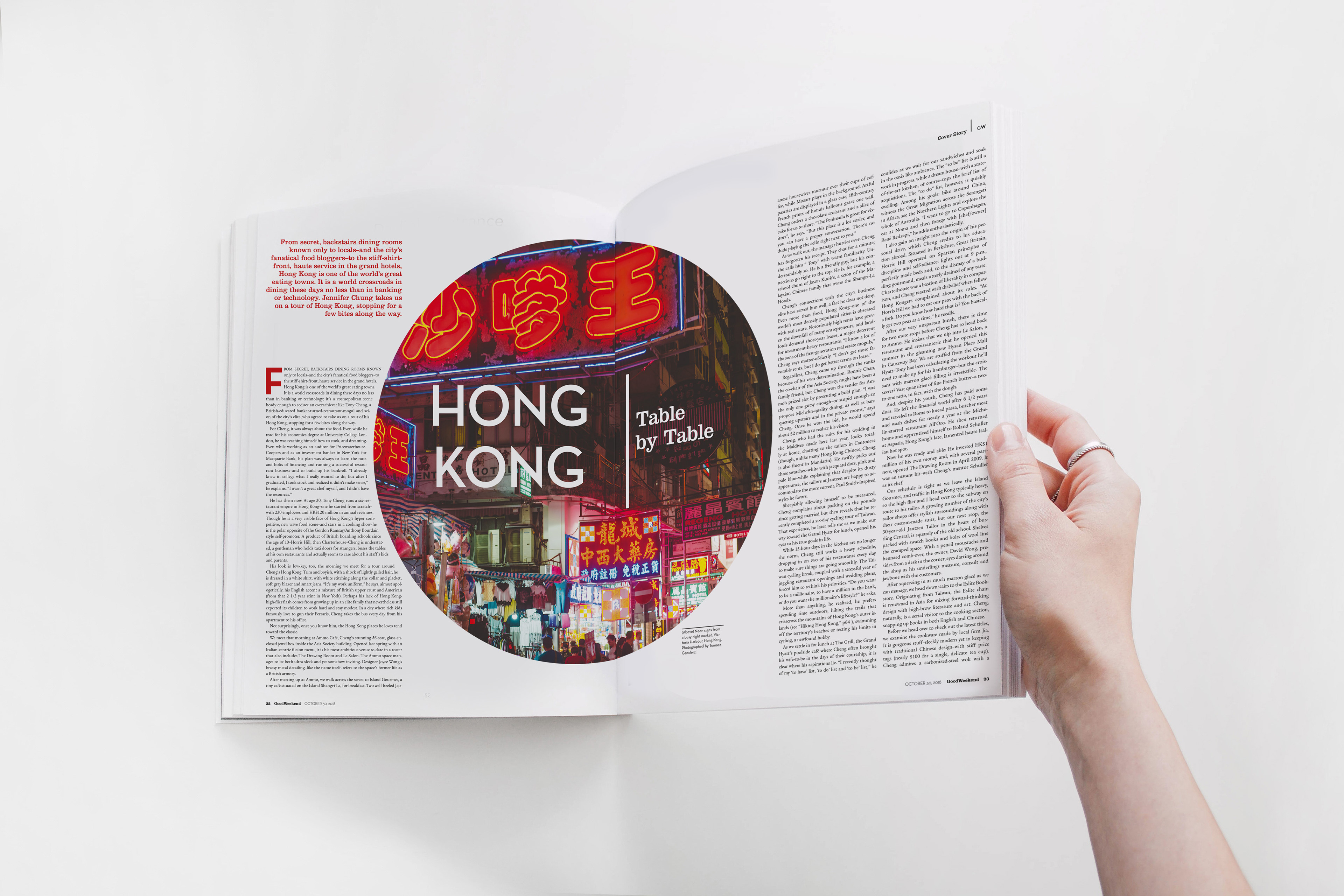 Spread opened by a hand, content about Hong Kong.